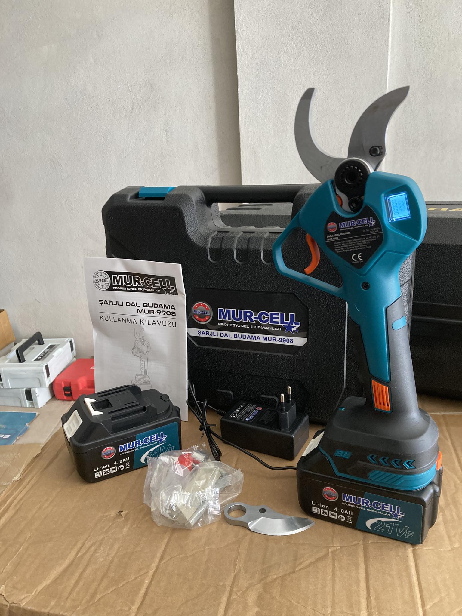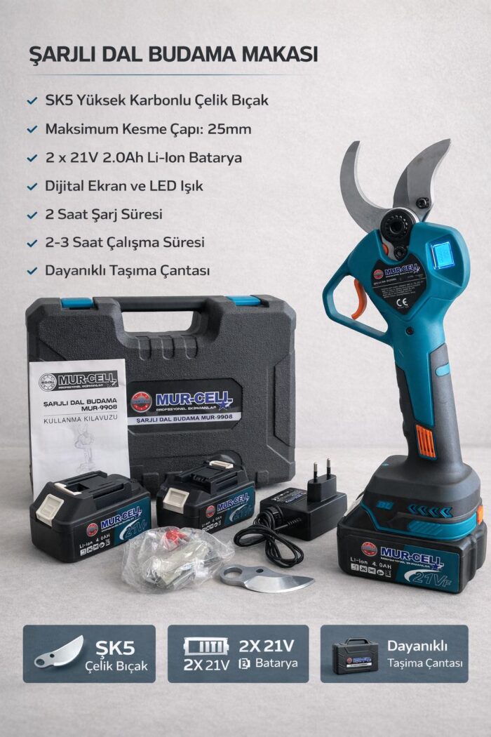 MUR-CELL MUR-9908 şarjlı budama makası; Keskin bıçağı, güçlü bataryası ve ergonomik tasarımıyla zahmetsiz budama imkanı sunuyor.